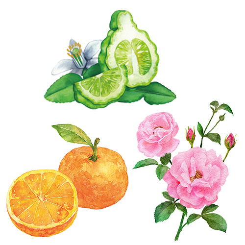 明るい印象のオレンジ果皮油 ・カボス果皮油 ・ベルガモット果実油 の3種のシトラスの精油に、イランイラン花油 ・ダマスクバラ花エキス・オオバナソケイ花エキス の優しいフローラルブーケが織りなす、リラクシングな香りです。