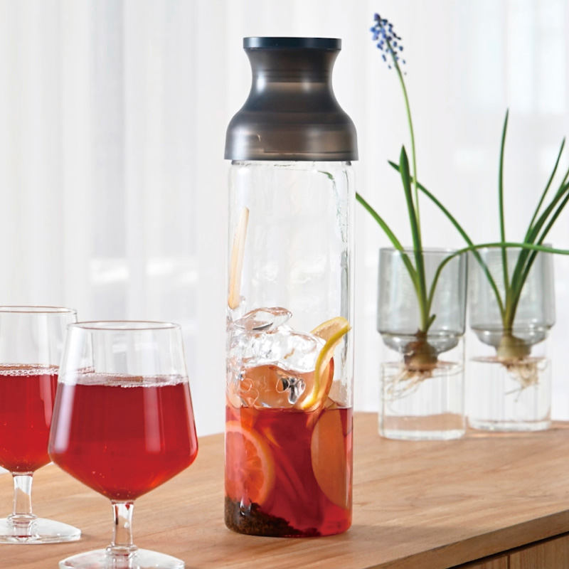 カラフェ型の水出し茶ボトル「ハリオ フィルターインカラフェ グレー」 水出し茶をもっと愉しめる! パーツが少ないので、よりお手入れも楽に パーツ全て食器洗い乾燥機OK 注ぎ口が広く、注ぎやすい 冷蔵庫のドアポケットにすっきり収納できる 容量1,000mL、カラーはグレー