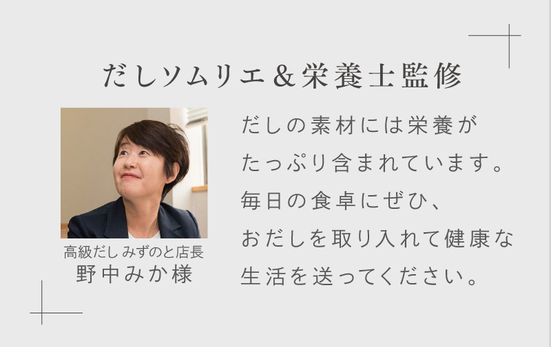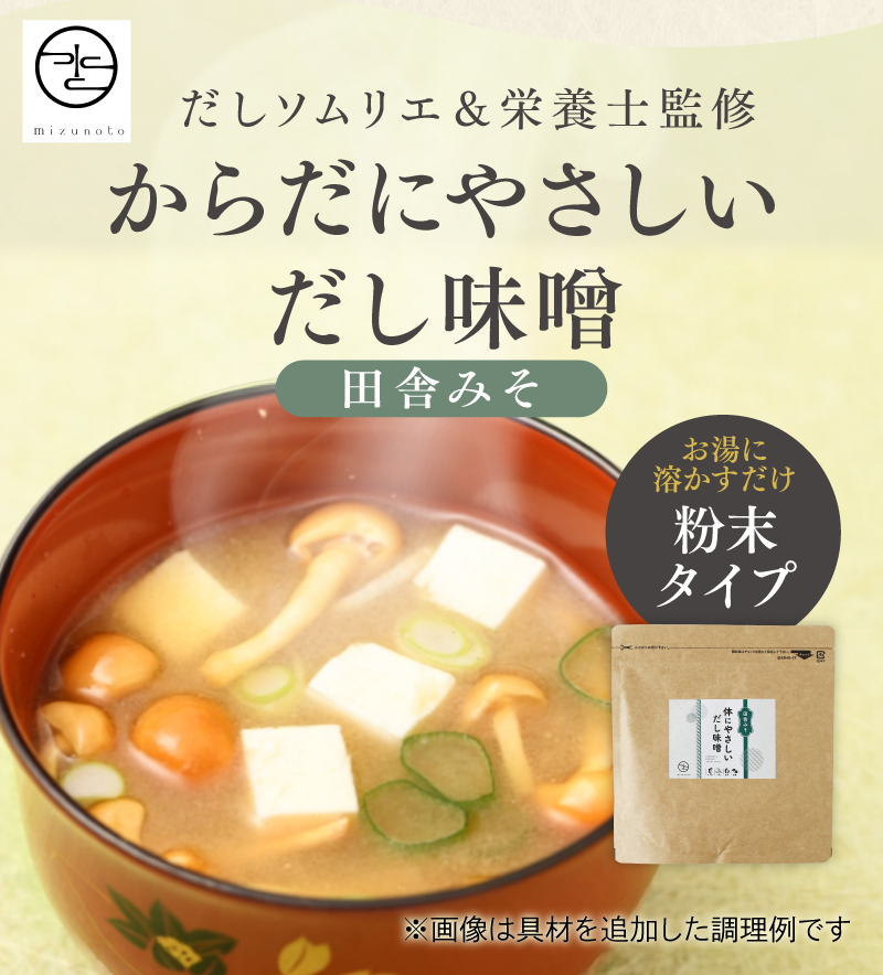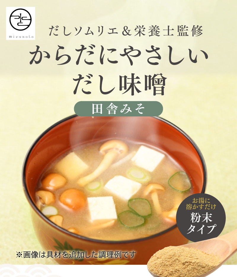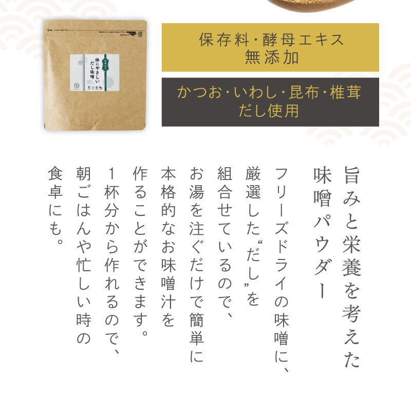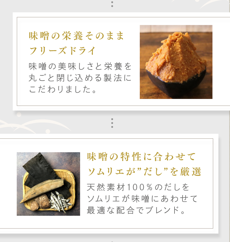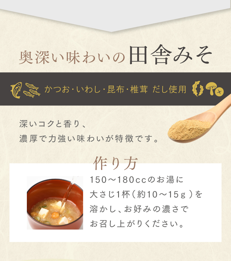 - 米みそ(大豆、米、塩)(国内製造)、鰹の節、鰯煮干、昆布、乾椎茸