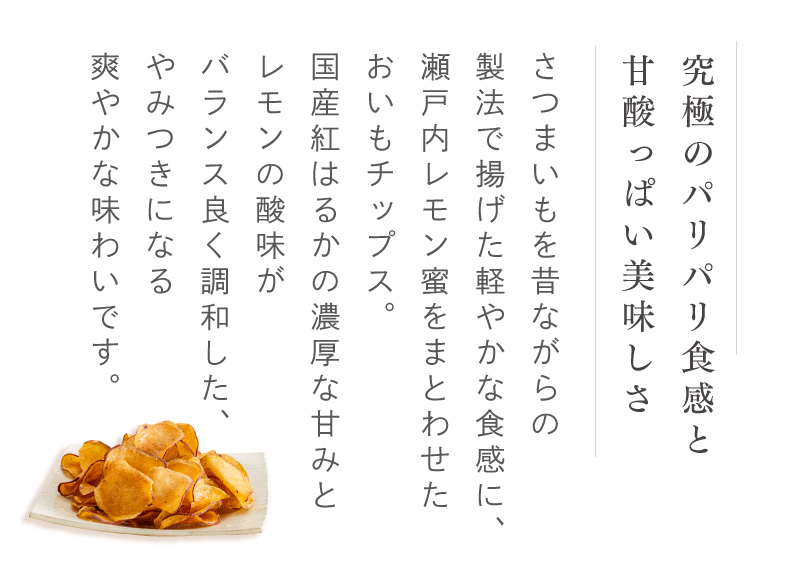 - さつまいも(国産)、植物油、砂糖、食塩、レモン果皮加工品(レモン(瀬戸内産))