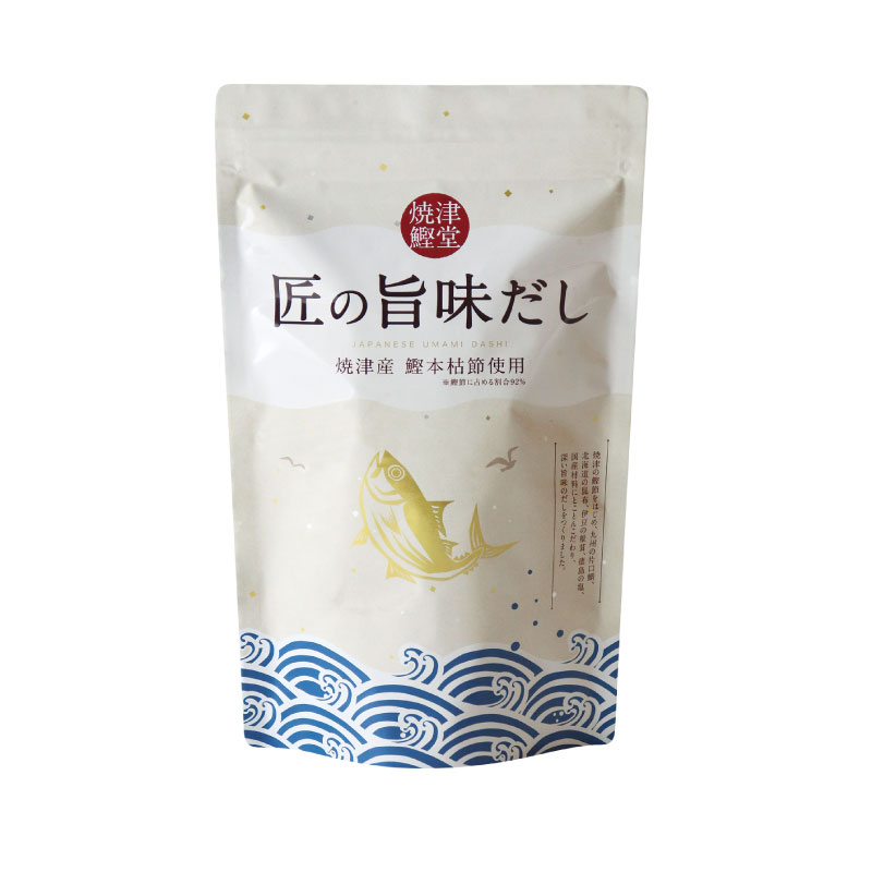おいしい出汁さえあればおうちで本格和食「匠の旨味だし」 いつもの一品をワンランク上の美味しさに 手軽なティーバッグタイプで本物の味わいを。厳選した素材を丁寧に粉砕し、きめ細かな粉末に。約2分煮出すだけで、簡単に本格だしをとることが可能 基本のだしの取り方!だしが変わるだけで、ちょっと特別なひと皿に だし巻き卵、炊き込みご飯、お味噌汁、茶碗蒸し 中身をそのまま調味料にしても◎お好み焼きやハンバーグの生地に混ぜ合わせて、炒飯や焼きそばなどの炒め物にはそのままふりかけて、天ぷらをそのままつけてもおすすめ 「匠の旨味だし」を使ったレシピはこちら お申込みはこちら 焼津から日本の食卓へ こだわりの鰹節「本枯節」だしをお届けしたい そんな焼津の名産である「本枯節」同じ静岡県に本社を構え、皆様の健康と生活をサポートする企業として、その深い味わいをご家庭でも手軽に味わっていただきたい。そんな想いから生まれたのが「焼津鰹堂 匠の旨味だし」です 本枯節の凝縮した旨味 旨味のかたまり「本枯節」は「荒節」に優良なカビ付けをしたものです。この特殊なカビは、乾燥した鰹節から水分をさらに抜き、魚の生臭さを取り除き、旨味を増すと言われています。 本枯節の黄金のだしを主役に!本枯節は脂肪分の分解も進むため、だしを取ったときに濁りのない澄んだ琥珀色のだしに仕上がります。 本枯節との相性を第一に、全国から厳選したこだわり素材「昆布・干し椎茸・片口鰯煮干し・荒節」 静岡県焼津産荒節、北海道産昆布 静岡県伊豆産干し椎茸、九州産片口鰯煮干し まずはだしそのままの味わいを いつもの料理に匠の旨味だし基本の分量 魚の煮付け、お味噌汁、おでんだし、かけうどんのつゆのだし分量 こんな料理にいかが?味しみ煮卵、なすの煮びたし、だしトマト、お吸い物、茶碗蒸し、だし巻き卵、焼きおにぎり、れんこんすり流し 動画つき!オリジナルアレンジレシピはこちら 匠の旨味だしQ&A:開封後の保存方法について 匠の旨味だしQ&A:煮出し後の冷蔵庫での保存期間について 匠の旨味だしQ&A:だしパックを水とお湯どちらで煮出すかについて、だしパックをずっと入れたまま調理をしてもいいか お申込みはこちら
