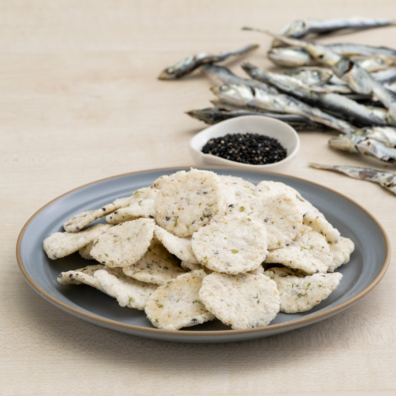 - 馬鈴薯でん粉(馬鈴薯(国産))、植物油、カタクチイワシ、えび、食塩、砂糖、ごま、アオサ、醤油、粉末昆布、発酵調味料、でん粉分解物、酵母エキス、チキンエキス/加工でん粉、コーラルカルシウム、調味料(アミノ酸等)、膨張剤、甘味料(ステビア)